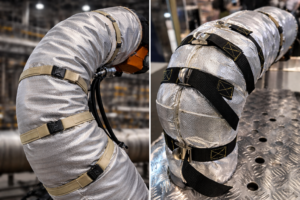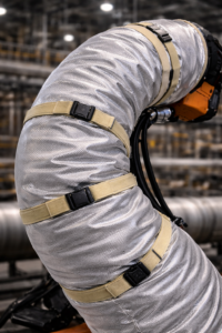 Fundas textiles confeccionadas a la medida para proteger robots industriales y equipos automatizados contra calor, chispa, salpicaduras, polvo y abrasión.